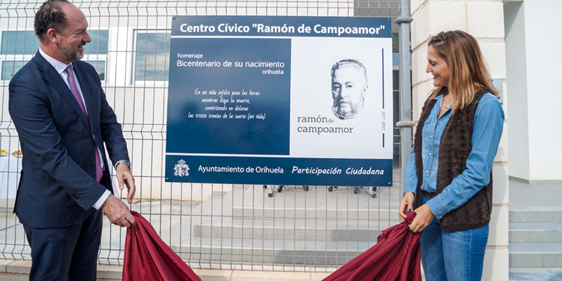 El alcalde de Orihuela, Emilio Bascuñana, descubrió este miércoles la placa conmemorativa al 200 aniversario del nacimiento del poeta Ramón de Campoamor en un acto homenaje organizado por la Concejalía de Participación Ciudadana, que dirige la edil Sabina-Goretti Galindo, con la finalidad de «dar nombre a este centro cívico de la costa para recordar al poeta en esta efeméride tan especial».