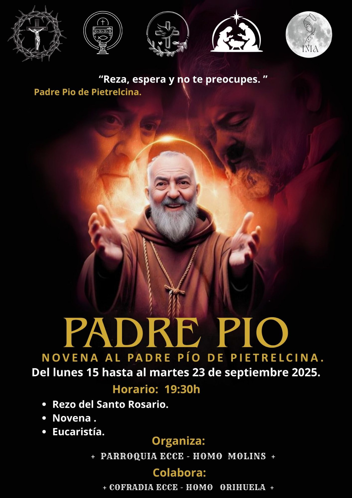 Recordar que desde el 15 hasta el 23 de septiembre se celebrará a partir de las 19.30h la novena del Padre Pio en la parroquia del Ecce Homo de Molins, y a su vez se podrá solicitar en estos días la capilla peregrina para la oración familiar.