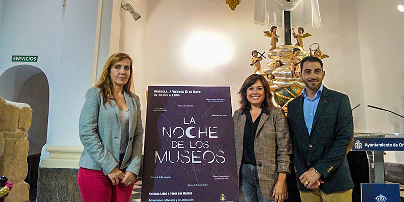 La concejal colaboradora en el área de Cultura, Mar Ezcurra, y los ediles de Comercio y Turismo, Dámaso Aparicio y Sofía Álvarez, respectivamente, presentaron este jueves la nueva edición de la “Noche de los Museos”, que se celebrará en Orihuela el próximo viernes, 13 de mayo, con motivo de la celebración del Día Internacional de los Museos el día 18. De esta manera, todos los museos permanecerán abiertos a partir de las 20.00 horas hasta la 1.00 de la madrugada. “Queremos que Orihuela sea un gran museo abierto y una oportunidad para redescubrir nuestra ciudad”, manifestó la edil Ezcurra. Y es que esta edición contará también con música, muestras gastronómicas, y actuaciones de baile entre otras, durante todo el recorrido museístico, desde Santo Domingo hasta la Plaza de Santiago.