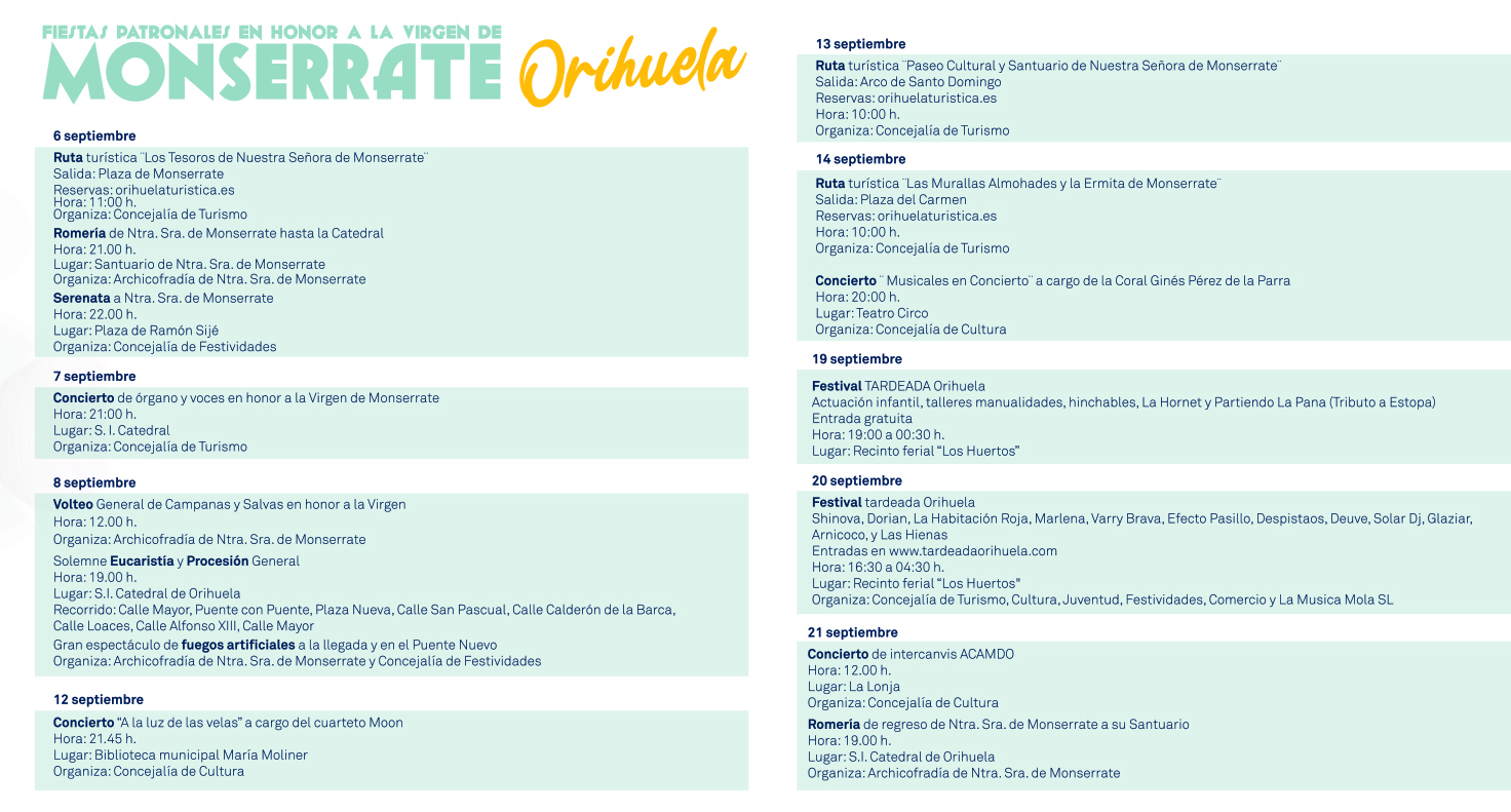 Entre los actos más significativos de estas fiestas destaca la Romería de la Virgen de Monserrate, que tendrá lugar el 6 de septiembre a partir de las 21.00 horas, partiendo desde el Santuario hasta la Catedral. Esa misma noche, a las 22.00 horas, se celebrará la tradicional serenata en la Plaza de Ramón Sijé. El 7 de septiembre, la Catedral acogerá a las 21.00 horas un concierto de órgano y voces en honor a la Patrona, organizado por la Concejalía de Turismo.
