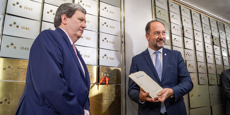El alcalde de Orihuela, Emilio Bascuñana, ha depositado este martes el legado de un ejemplar de la primera edición de la obra de Miguel Hernández, «Perito en lunas», en la Caja de las Letras del Instituto Cervantes, con la finalidad de que «permanezca para siempre y futuras generaciones puedan conocer esta obra magistral poética de nuestro escritor más universal», ha asegurado Bascuñana, quien ha estado acompañado por el director del Instituto Cervantes, Juan Manuel Bonet, así como por el concejal de Patrimonio Histórico, Rafael Almagro.