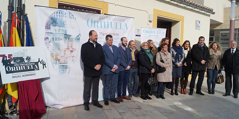 El alcalde de Orihuela y los concejales del Equipo de Gobierno dieron a conocer este martes la imagen con la que Orihuela promocionará la celebración del Año Hernandiano 2017, con motivo de la conmemoración del 75º aniversario de la muerte de Miguel Hernández. El escenario escogido para la ocasión fue el Rincón Hernandiano, donde se mostró el cartel anunciador de esta efeméride que protagoniza el rostro del poeta oriolano junto al logo del evento, elaborado por el artista Pepe Aledo y por el lema “Miguel Hernández, memoria viva de Orihuela”.