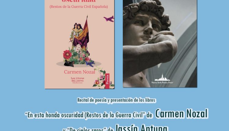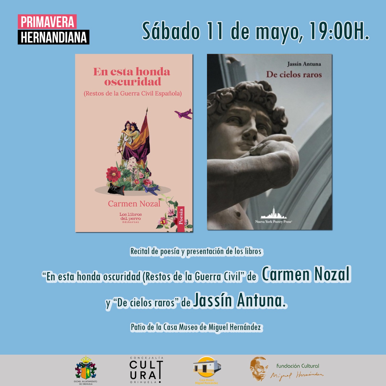 Este próximo sábado día 11 de mayo, los poetas Carmen Nozal y Jassín Antuna ofrecerán en el patio de la Casa Museo de Miguel Hernández, a partir de las 19:00 horas, un recital de poesía y presentarán sus dos últimos libros: “En esta honda oscuridad (Restos de la Guerra Civil Española)” y “De cielos raros”, respectivamente.