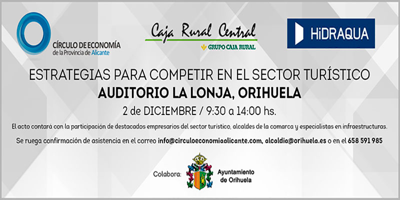 Bajo el título ‘Estrategias para competir en el sector turístico’, el Círculo de Economía de la Provincia Alicante organiza, en colaboración con el Ayuntamiento de Orihuela, una jornada (9:30 a 14:00h) en la que estarán presentes el diputado de Turismo, Eduardo Dolón, y la directora general de Turismo de la Comunidad Valenciana, Raquel Huete.