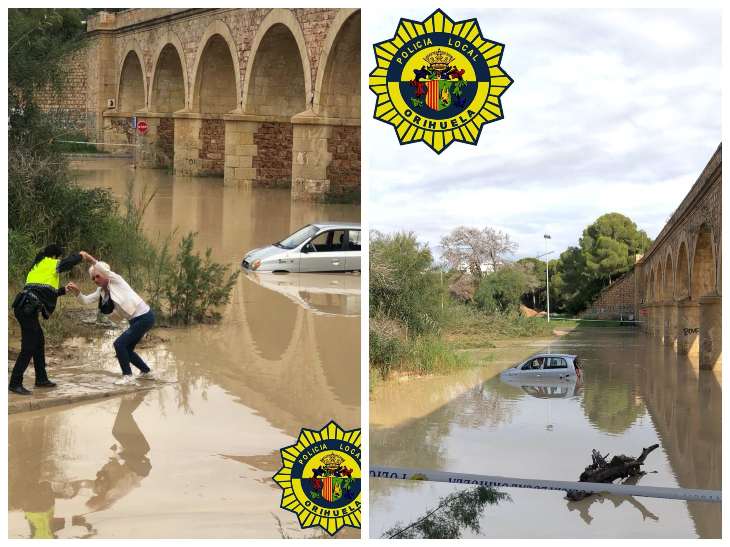 La Policía Local de Orihuela ha rescatado a una conductora atrapada en su vehículo, en el paso de la carretera por el cauce de la rambla del Río Nacimiento en Campoamor.