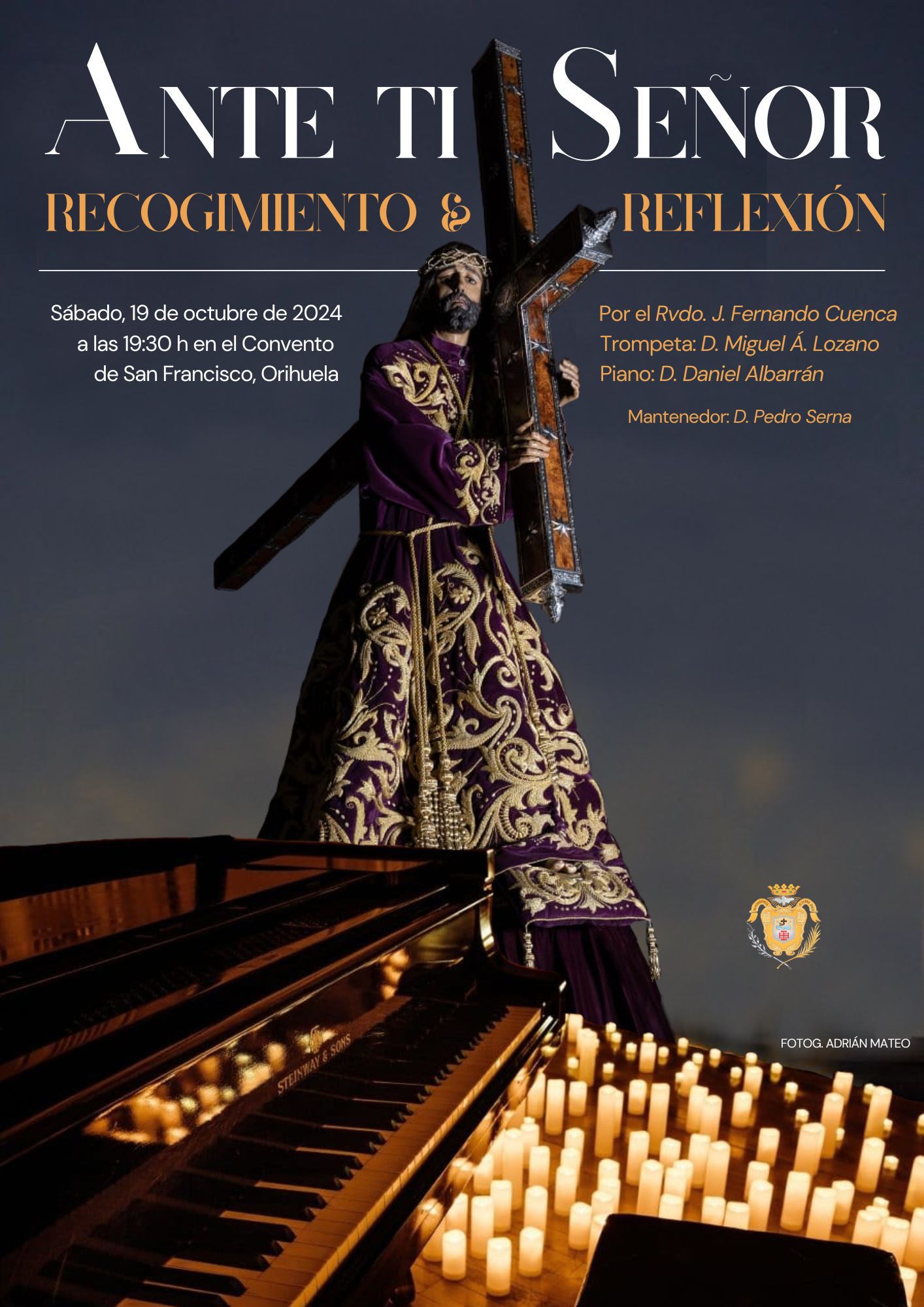 Además, y como novedad, el sábado 19 de octubre a las 19:30 horas se llevará a cabo ante la luz de las velas y ante los pies de Nuestro Padre Jesús ‘ANTE TI, SEÑOR’: un acto de música y reflexión presidido por el Rvdo. P. Juan Fernando Cuenca y que contará con la actuación musical del sevillano D. Daniel Albarrán al piano y el oriolano D. Miguel Ángel Lozano a la trompeta. El acto estará conducido por D. Pedro Serna Carbonero.
