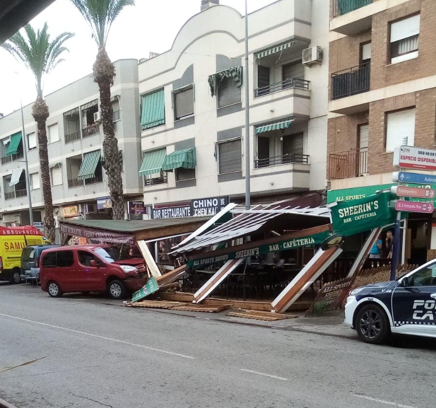 Sobre las 18 horas del jueves, 20 de julio, un coche se salía de la vía y colisionaba contra la terraza de un bar en la calle La Purísima de Catral.