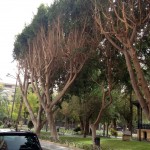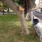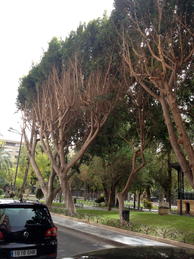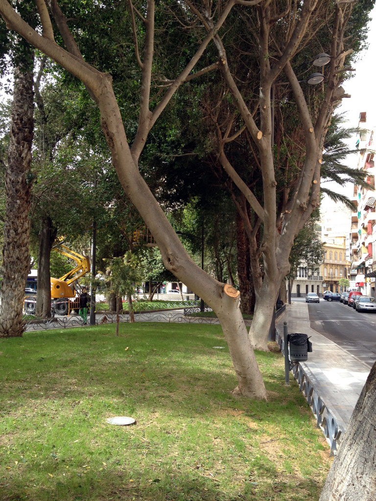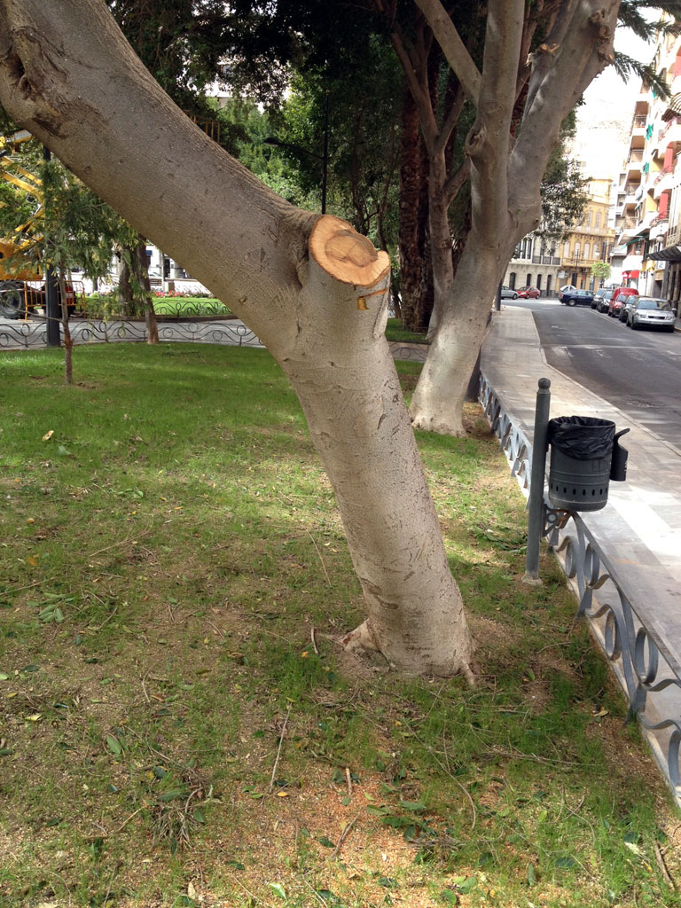 La poda que se ha realizado en la Glorieta Gabriel Miró, contra los ficus que la bordean, protagonizada por el área de parques y jardines del Ayuntamiento de Orihuela, cuyo responsable es D. Víctor Manuel Ruiz (PSOE), es una salvajada.