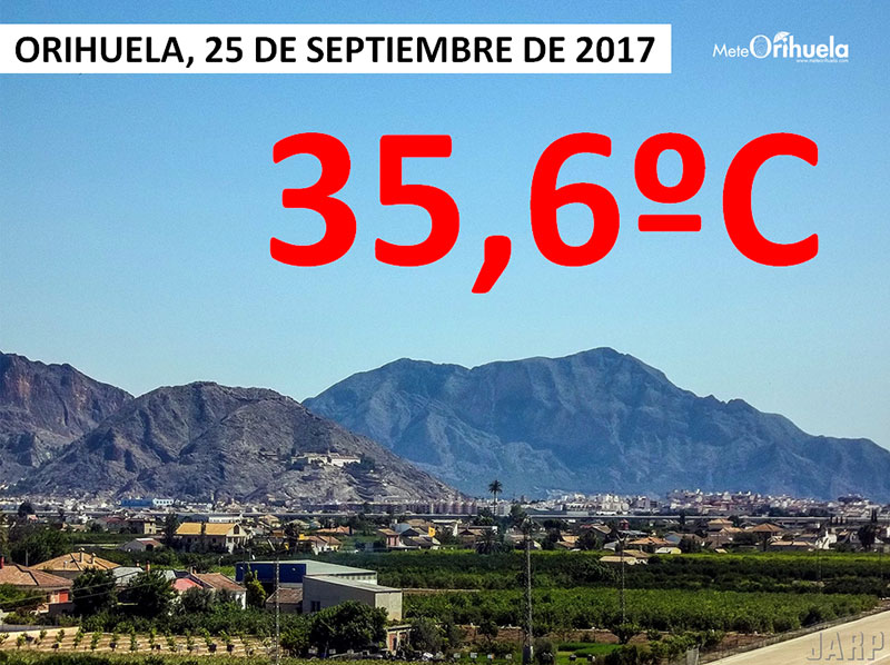 Hoy en Orihuela se han alcanzado 35,6ºC a las 16:04 horas. Otras temperaturas máximas de hoy en la comarca de la Vega Baja del Segura son: Redován 36,4ºC; La Campaneta 35,1ºC; San Bartolomé 34,7ºC; Dolores 34,4ºC; Rojales 33,0ºC; Guardamar del Segura 31,3ºC; Torrevieja 30,4ºC.